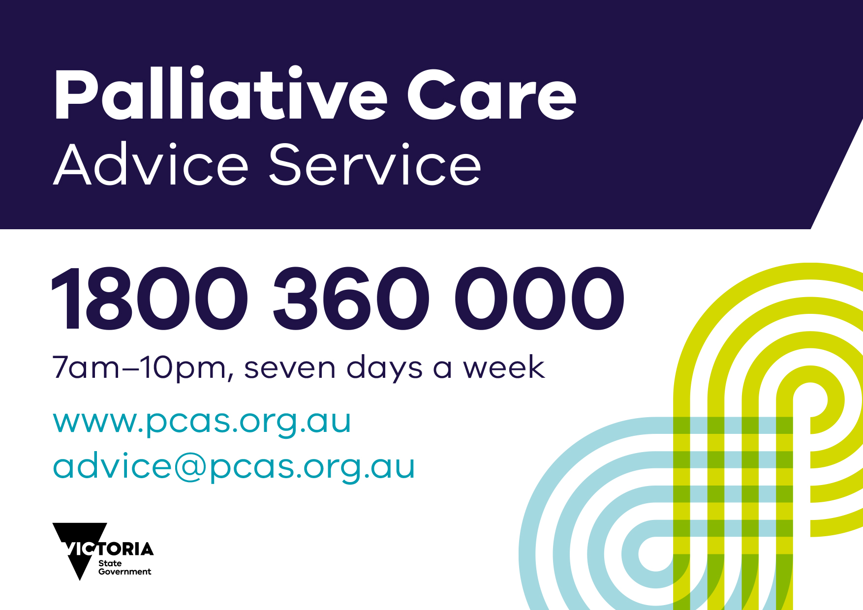 Delivered by The Royal Melbourne Hospital, the state-wide Palliative Care Advice Service operates from 7:00am – 10:00pm, seven days a week and can be contacted on 1800 360 000 or pcas.org.au