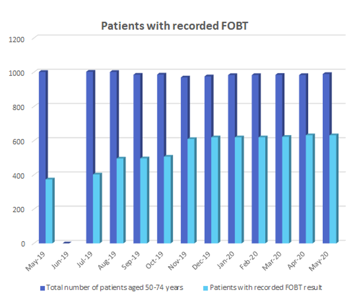 - Through increased screening efforts and by improving our existing records, we increased the number of patient records with an FOBT recorded by 25.7 per cent between May 2019 – May 2020 (as shown in the graph below).