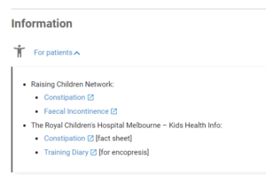 The GP confidently prescribes Tara stool softeners using the information provided in the pathway (stool softener drop down, image below) and advises Sara how to wean the medication down to a medication dose until Tara has soft bowel actions and is a ‘happy pooer’.