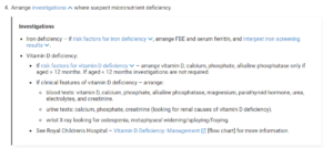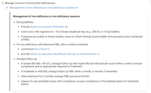 The GP then consults the Infant and Toddler Nutrition and Feeding Concerns pathway to address the suspected Iron deficiency +/- anaemia as a result of excessive cow’s milk consumption and is advised to arrange a full blood count and serum ferritin to confirm diagnosis.