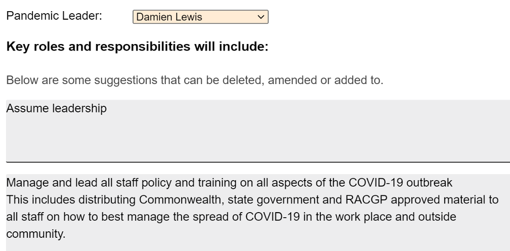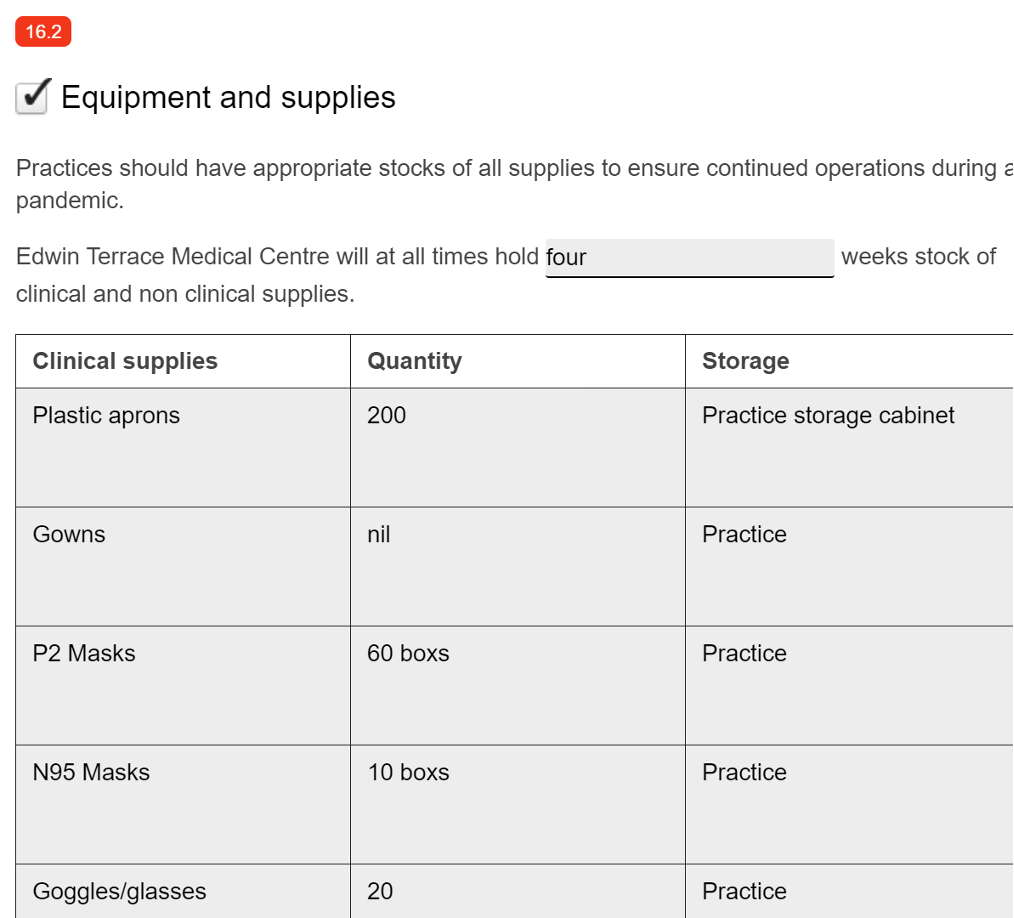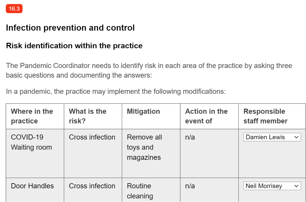 The pandemic section contains and guides the practice through the following processes and procedures