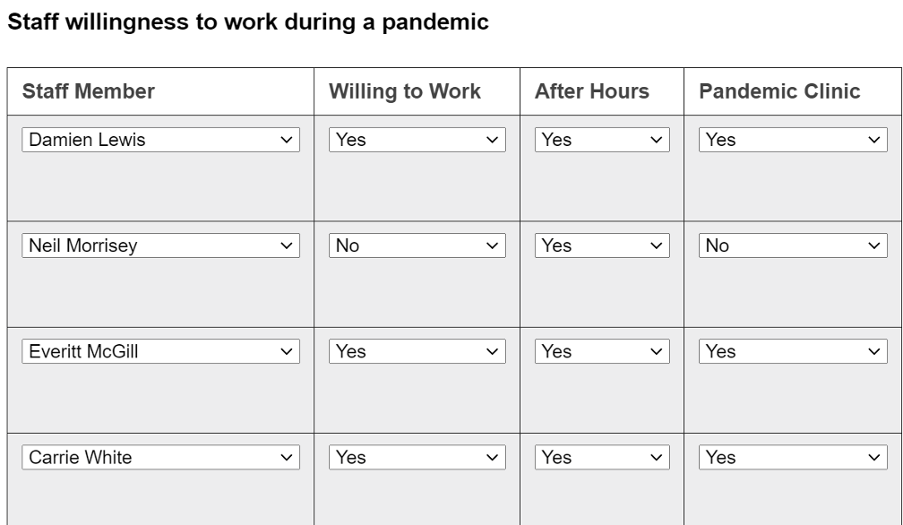 - Staff rostering and willingness to work