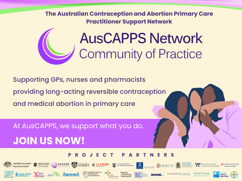 In response to these issues, AusCAPPS Network was launched in July 2021 to support the Australian primary care workforce (including general practitioners, practice nurses and community pharmacists) in providing contraception and abortion care. AusCAPPS is a national, secure and free online space that provides: