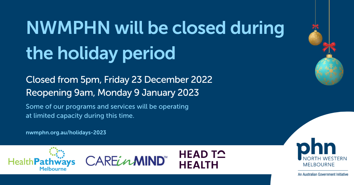 North Western Melbourne Primary Health Network (NWMPHN) will be closed from 5pm, Friday 23 December 2022 and will reopen 9am, Monday 9 January 2023.