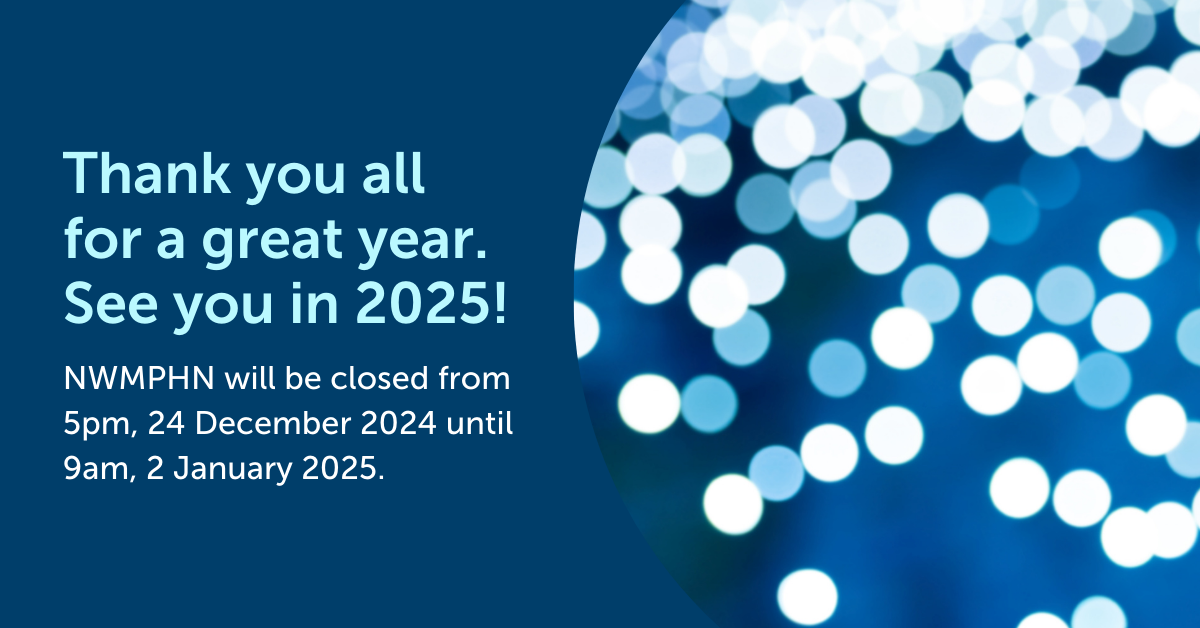 North Western Melbourne Primary Health Network (NWMPHN) will close at 5pm, Tuesday, 24 December 2024 and reopen at 9am, Thursday, 2 January 2025.