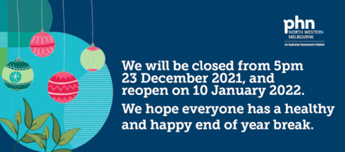 The North Western Melbourne Primary Health Network (NWMPHN) office will be closed from 5:00pm on Thursday, 23 December 2021 and reopen at 9:00am on Monday, 10 January 2022.