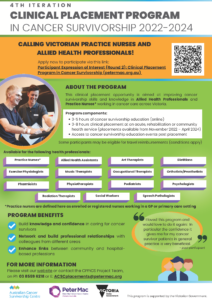 The Clinical Placement Program in Cancer Survivorship (CPPiCS), funded by the Victorian Government and co-ordinated by the Australian Cancer Survivorship Centre, is underway and will be commencing the 2nd round of participant recruitment in February 2023.