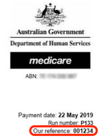 You can find your Practice ID located on your payment statement. The practice ID is in the top right-hand corner of the first page of the statement, labelled “Our reference” (see image), under the Australian Government crest for the Department of Human Services.