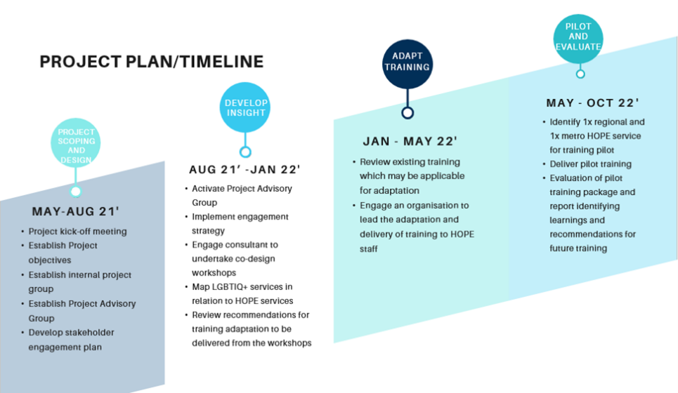 In late 2021, consultant agency Impact Co. was contracted to review existing training packages with representatives from HOPE services and LBGTIQ+ community members to inform recommendations for training adaptation.