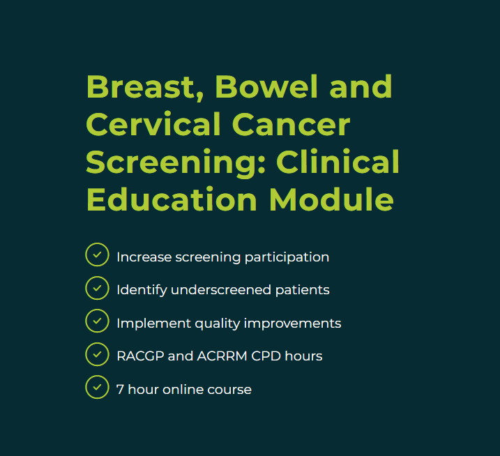 This course by Gpex will address challenges, dispel myths and uncertainties around screening, offer tips to boost screening, and provide further resources for your practice. The course is CPD accredited with RACGP and ACRRM for the 2023-2025 triennium.