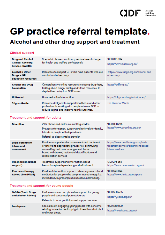 The Alcohol and Drug Foundation in collaboration with the Royal Australian College of General Practitioners (RACGP) have developed a quick referral guide for GPs on alcohol and drug services in Victoria. This referral guide has been developed to make it easier for GPs to direct their patients to the most appropriate treatment and support services.
