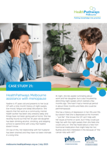 Nadine is 47 years old and presents to her local GP with a nine-month history of night sweats, low mood, fatigue and sleep disturbance. She reports that her work as a community mental health worker has been very stressful lately and things have not been going well at home. She has recently found out that her 16-year-old daughter has been drinking alcohol, smoking, and skipping school to spend time with a boy that Nadine doesn’t know.