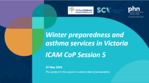 Community of practice (CoP) sessions aim to improve clinician confidence in managing childhood asthma, and foster collaboration between asthma care services in the inner west of Melbourne, the Royal Children’s Hospital (RCH), Asthma Australia and the National Asthma Council Australia.