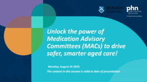 This webinar is for GPs, nurses, allied health, aged care workers and other clinicans working with residential aged care homes, especially those involved in medication reviews, clinical governance and or multidisciplinary care. It explores how Medication Advisory Committees (MACs) can use a multidisciplinary systems approach to promote medication safety and improve outcomes for all residents.